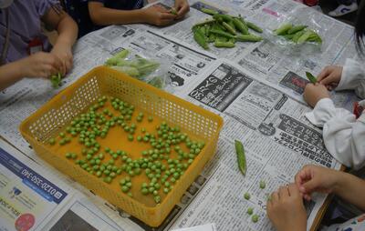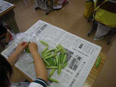 5月13日 1年生とあゆみ学級 グリンピースのさやむき