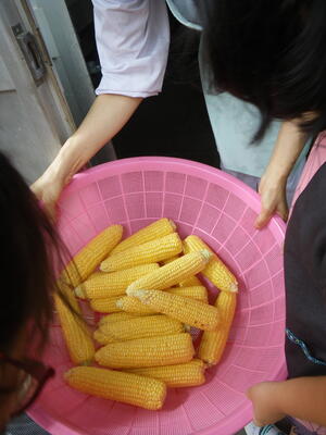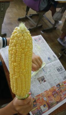 むいたとうもろこしは、みんなでいっしょに給食室まで届けました。そして給食時間に、甘くておいしいゆでとうもろこしをみんなでおいしく食べました!!