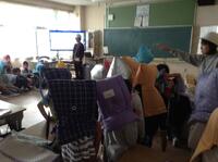 地震発生の放送が流れると、入学したての1年生も机の下に1次避難をしました。
