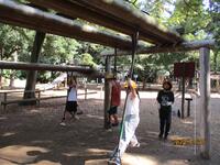 ロープの輪を両手に広げて持ち、シャボン玉液につけ、シャボン玉を作ります。