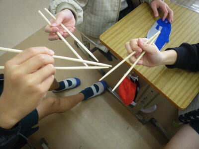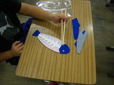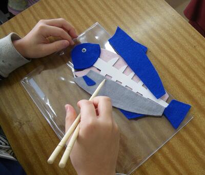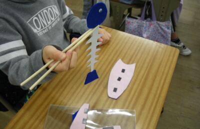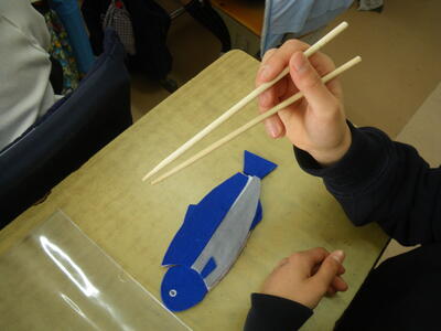 今日は事前学習として、フェルトで作ったお魚の人形を使い、頭と骨、尾のついたお魚をどうやって上手に食べるかを学びました。すでに家で練習してきたという子どももいて、意気込みを感じました。1年生、2年生の時にお箸の持ち方について学習したことが、確実に身についている様子が見てとれました。