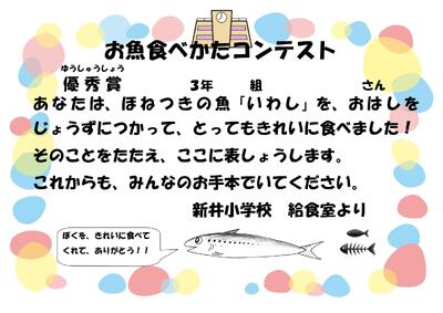 各クラスから「優秀賞」を3名ずつ選び、賞状といっしょに副賞として「食べたいわしの写真」をラミネートしたものをプレゼントしました。