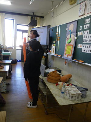 毎日を元気に過ごすためには「早寝、早起き、朝ごはん、朝うんち」が必要だということを、パワーポイントや人の小腸、大腸の模型などを使って学びました。この4つをしっかり守って、いつも決まった時間にうんちが出る人は、食中毒にもなりにくいじょうぶなおなかになるのだそうです。