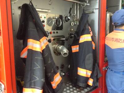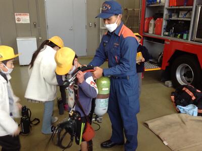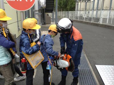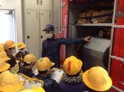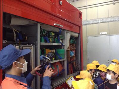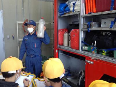消防の方は、車両の設備や道具についてていねいに教えてくださいました。