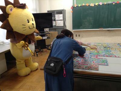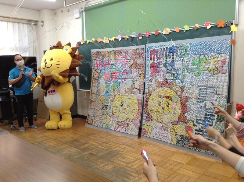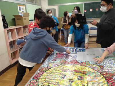 教室で謎を解いたり、校庭で出し物に参加したり、校内を探検してクイズの答えを探したりしながら、ひらめきカードの色を塗っていきます。一枚のカードでは何のことやらわかりませんが、グループのカードを合わせ、それを同じ教室のグループ同士を合わせ・・・全校で合わせると・・・大きな絵が現れました。モザイクアートです。