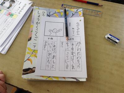 1年生の授業は【みぶりをつたえる】という教材文で勉強したことをペア学年の6年生に図鑑にして伝えようという活