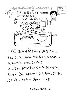 5月31日の給食(1年生とあゆみ学級、そらまめのさやむき)
