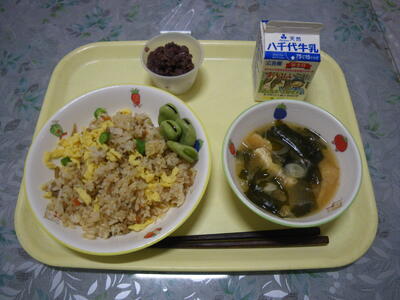 枝豆とコーンのかみかみご飯 牛乳 ししゃものパリパリ揚げ くきわかめのサラダ 大根のみそ汁 みかんのひとくちゼリー
