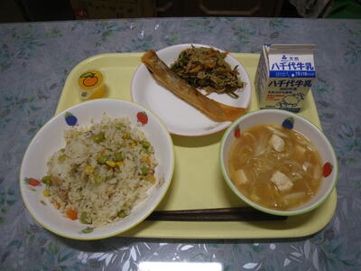 代表的な春野菜の「ふき(蕗)」。給食室では、生のふきを下ゆでして、皮をむいてていねいに刻み、ご飯に入れました。子どもたちは「おいしい!」と言って食べていましたが、全体的にボリューム感ある献立だったのか、ご飯の残菜が多めだったのが残念です。ボラのフライは人気で、よく食べていました。