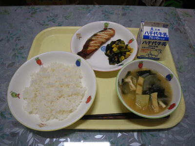 ごはん 牛乳 鮭の和風マヨネーズ焼き 納豆あえ さつま汁 アップルシャーベット