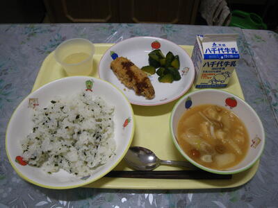 さつまいもコロッケとわかめご飯が人気でした。手作りのコロッケは、とても手間がかかる料理ですが、子どもたちがうれしそうに食べているのを見ると、がんばろう!という気持ちになります。