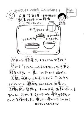読書フェスティバル給食として、コロッケにちなみ「11ぴきのねことあほうどり」という本を紹介しました。