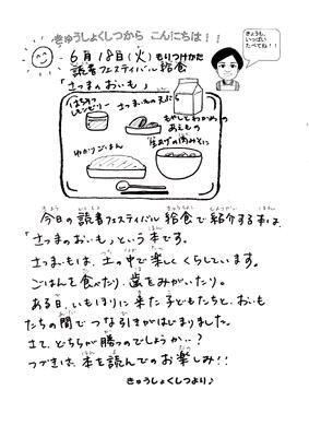 今日も読書フェスティバル給食!お手紙では、「さつまのおいも」を紹介しましたが、お昼の放送では図書委員さんが「おばけの天ぷら」を読み聞かせしてくれました。楽しそうなお話でした!