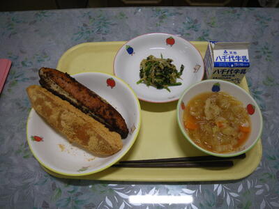 さつまいもご飯 牛乳 いわしのさんが焼き 小松菜のマヨネーズ和え 白菜の具だくさん汁 オレンジゼリー