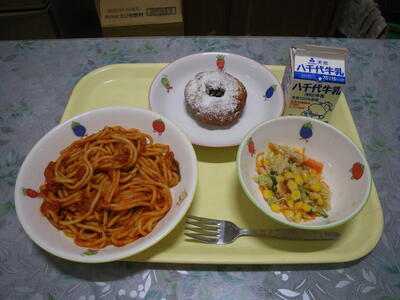 なすとツナのトマトスパゲティ 牛乳 コーンサラダ かぼちゃドーナッツ
