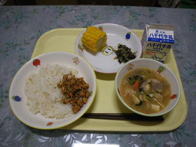 麦ごはん 牛乳 大豆とじゃこのふりかけ 磯和え 豚汁 ゆでとうもろこし