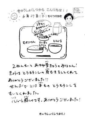 6月27日の給食(2年生とあゆみ学級 とうもろこしの皮むき)