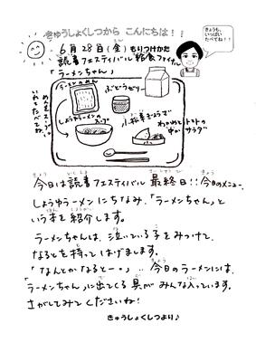 今日は読書フェスティバル最終日。「ラーメンちゃん」という本に登場する、ラーメンを作りました。