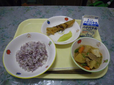 油揚げご飯 牛乳 にぎすのパリパリ揚げ 豚汁 牛乳プリン