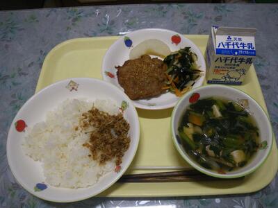 麦ごはん 牛乳 かぼちゃハンバーグ くきわかめの佃煮 豚汁 ぶどう