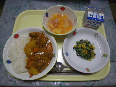 カレーライス 牛乳 ほうれん草とコーンのソテー フルーツポンチ