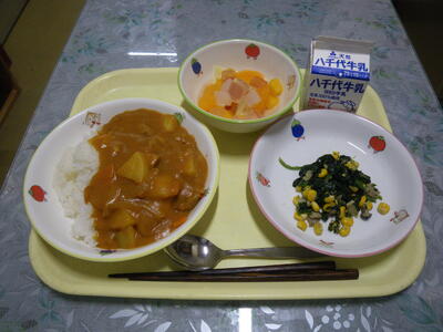 カレーライス 牛乳 ほうれん草とコーンのソテー フルーツポンチ