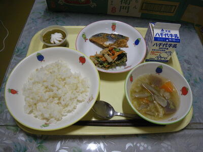 ご飯 牛乳 さばの味噌煮 小松菜のマヨネーズ和え 白菜の具だくさん汁 豆乳抹茶ゼリー