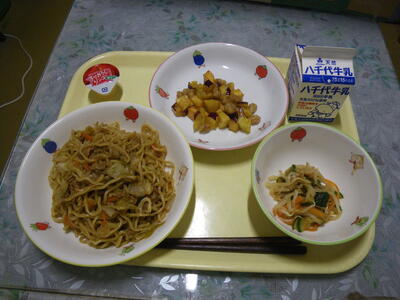 ソース焼きそば 牛乳 キャラメルポテト もやしサラダ りんごの一口ゼリー