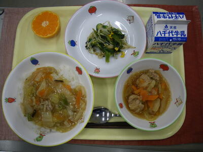 中華丼 牛乳 中華和え 肉団子スープ 花みかん