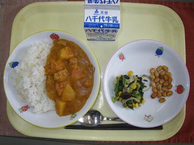 カレーライス 牛乳 ほうれん草とコーンのソテー しゃりしゃりガーリック大豆