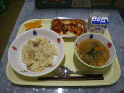 ウィンナーピラフ 牛乳 とうふのミートグラタン キャベツのスープ オレンジ