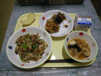 ひじきごはん 牛乳 大豆のかき揚げ 白菜のおひたし ひとくちおでん りんご