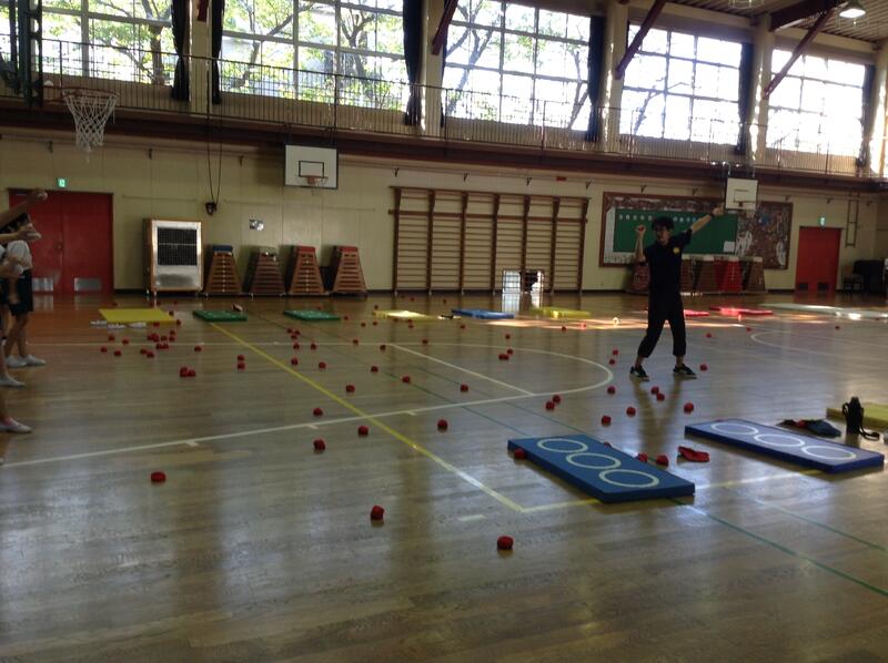 2回目の実施に向けて、体育科の時間に紅白玉を使って【投げる】練習をしたり、