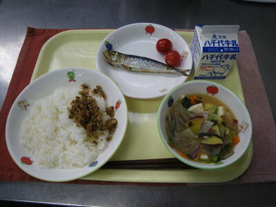 ごはん 牛乳 さばの塩焼き(4年生と3の4は、いわしの塩焼き) ミニトマト 豚汁 はちみつレモンゼリー