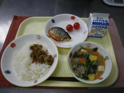 ご飯 牛乳 エコふりかけ さばの塩焼き(3年生はいわしの塩焼き) ミニトマト さつま汁