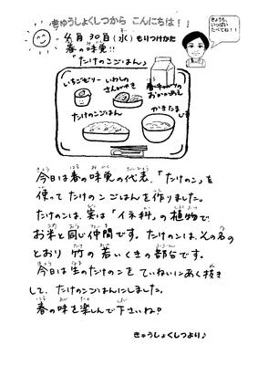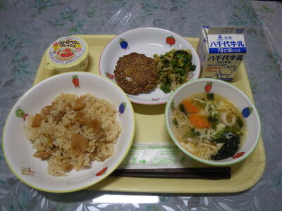 たけのこご飯 牛乳 いわしのさんが焼き 春キャベツのおかか和え かきたま汁 いちごゼリー
