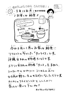 リクエストの多い「タコライス」をお楽しみ給食として提供しました。メキシコ料理の「タコス」は、トルティーヤというトウモロコシの粉で作った生地に、野菜やひき肉を包んで食べますが、トルティーヤに代わってご飯を使ったのがこの「タコライス」です。沖縄で生まれた料理だそうです。