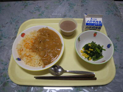 キャロットライス 牛乳 ハッシュドポーク ほうれん草のサラダ チョコレートプリン