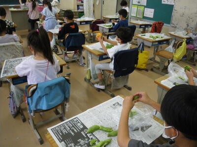 5月31日(金)、1年生とあゆみ学級の子どもたちが、給食に使うそらまめのさやむきを行いました。