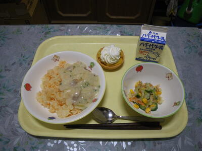 キャロットライスクリームソースかけ 牛乳 コーンサラダ かぼちゃのタルト