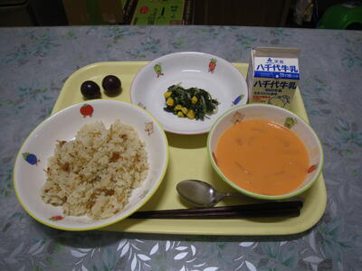 じゃこガーリックライス 牛乳 ほうれん草のサラダ にんじんポタージュ ぶどう