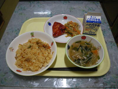 キムチご飯 牛乳 ヤンニョムチキン 中華もやし 中華スープ