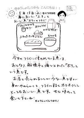 代表的な春野菜の「ふき(蕗)」。給食室では、生のふきを下ゆでして、皮をむいてていねいに刻み、ご飯に入れました。子どもたちは「おいしい!」と言って食べていましたが、全体的にボリューム感ある献立だったのか、ご飯の残菜が多めだったのが残念です。ボラのフライは人気で、よく食べていました。