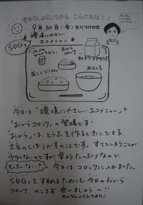 「黙食」なので、いつも給食時には子どもたちと手話で会話をしていますが、今日は「全部おいしいよ!」と手話で伝えてくれた子どもが何人もいました。とてもうれしかったです。レバーは、一度下茹でをしてから生姜醤油につけてくさみを抜き、米粉をまぶして油で揚げています。揚げるとレバー独特のくさみが消えて、おいしく食べられます!