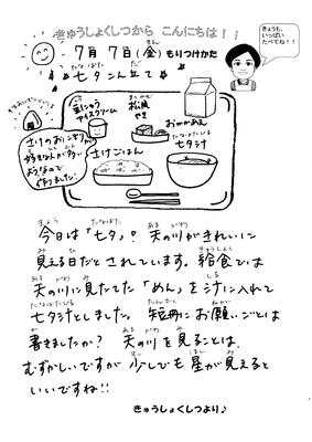 鮭ごはん 牛乳 松風焼き おかか和え 七夕汁 豆乳アイスクリーム
