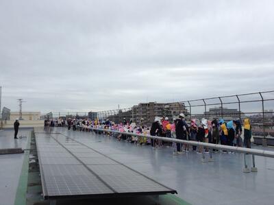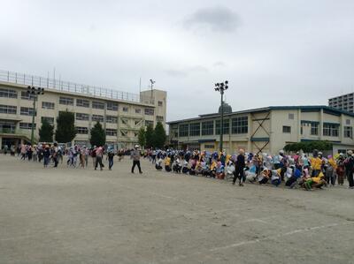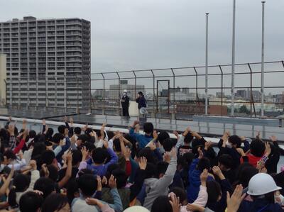 地震発生からの校庭への避難完了が約5分。津波発生の知らせを受けて校庭から校舎4階屋上への避難は約10分以内の完了となりました。先生方の迅速な対応と子どもたちの素早い行動の結果です。