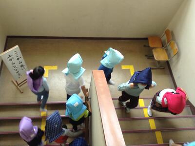 訓練後は、担任の先生より避難経路の確認、「お・か・し・も」の確認、「ドロップ、カバー、ホールドオン」の安全行動の確認など丁寧に指導しています。