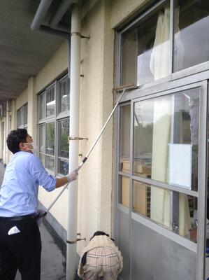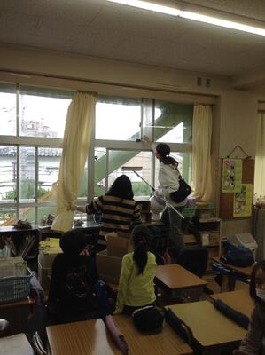訓練後に、砂ぼこりで汚れた廊下や階段を6年生が一生懸命に掃除する姿がありました。