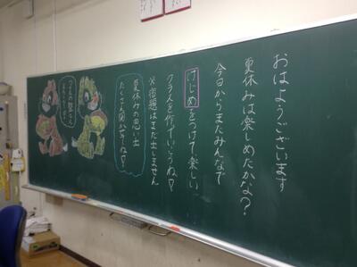 「先生は夏休みどこか行くの?」「僕はねー、静岡行くんだ」「私は、館山」「大阪行くんだよ」