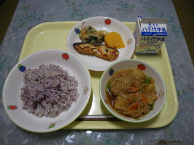 茶飯 牛乳 レバーのかりん揚げ 青菜とツナのあえ物 一口おでん 柿